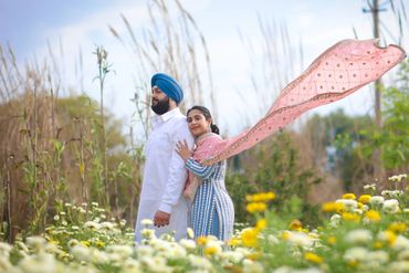 A stylish pre-wedding shot across Delhi’s scenic outskirts with natural landscapes, fresh vibes, and modern aesthetics.